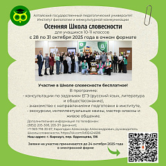 Институт филологии и межкультурной коммуникации АлтГПУ объявляет набор на профильную смену – осеннюю Школу словесности, – которая пройдет с 28 по 31 октября 2025 года в очном формате.