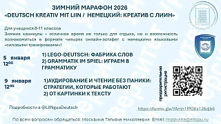 5 января в 12:00 учащиеся 8-11 классов могут принять участие в онлайн-эстафете с немецкими языковыми тренировками в рамках Зимнего марафона – 2026 «Deutsch kreativ mit LIIN / Немецкий: креатив с ЛИИН».