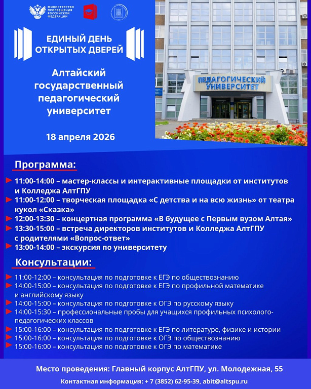 Приглашаем учащихся школ, их родителей и выпускников образовательных организаций СПО посетить 18 апреля ЕДИНЫЙ ДЕНЬ ОТКРЫТЫХ ДВЕРЕЙ педагогических университетов России в Алтайском государственном педагогическом университете.