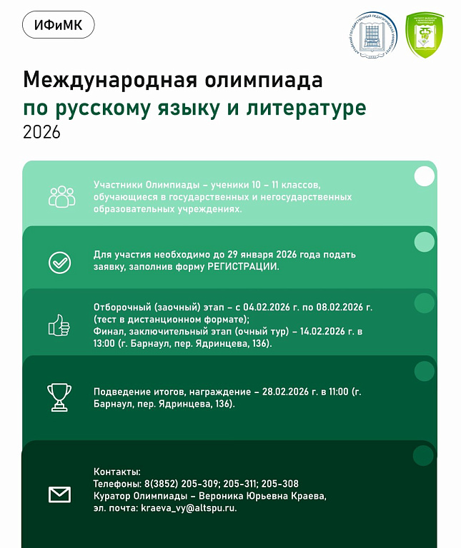 Олимпиада проходит в два этапа: отборочный этап 04.02.2026 г. – 08.02.2026 г.; заключительный этап 15.02.2026 г.