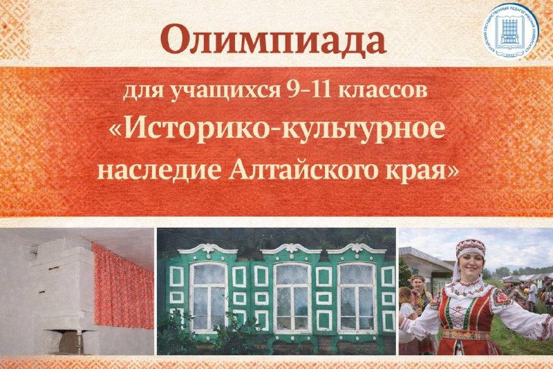 Приглашаем Вас принять участие в краевой олимпиаде среди учащихся 9–11 классов общеобразовательных школ Алтайского края «Историко-культурное наследие Алтайского края», которая состоится 29 апреля 2026 года в online формате. Олимпиада посвящена Году единства народов России, утверждённому Указом Президента Российской Федерации В.В. Путина, 120-летию с начала реализации Столыпинской аграрной реформы.